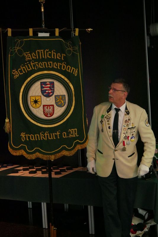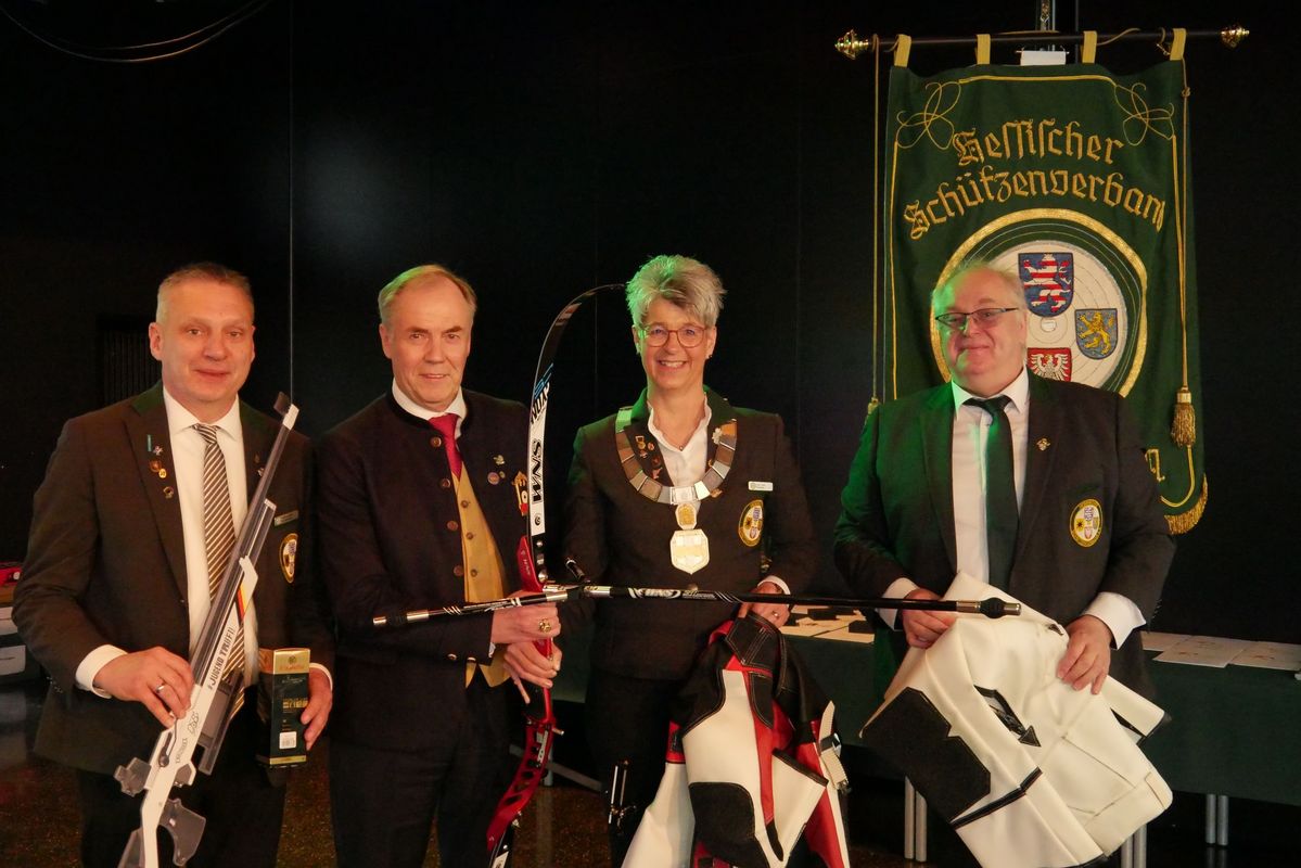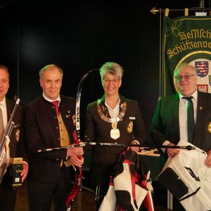 Hans-Heinrich von Schönfels, der in der Doppelfunktion als Präsident des Deutschen Schützenbundes (DSB) und Ehrenpräsident des Hessischen Schützenverbandes sprach, erinnerte an die tiefe historische Verwurzelung des hessischen Schießsports auf Bundesebene. Er stellte fest, dass das deutsche Sportschießen dem hessischen Verband viel zu verdanken habe. So sei mit Paul Wehner bereits der erste DSB-Präsident ein Hesse gewesen, und Hessen habe als erster Landesverband ein modernes Landesleistungszentrum etabliert. Auch der heutige Sitz des DSB am Olympiastützpunkt Wiesbaden/Frankfurt am Main gehe auf die Initiative des Hessen Georg von Opel zurück, der den Verband von 1957 bis 1971 führte. Um die Zukunft des Sports zu sichern, übergab von Schönfels ein Luftgewehr, einen Bogen sowie einen Gutschein für Schießsportbekleidung der Firma Sauer an den Landesjugendleiter Stefan Rinke, der sich für diese großzügige Unterstützung der Nachwuchsarbeit bedankte.