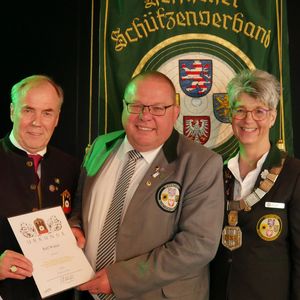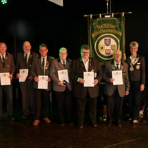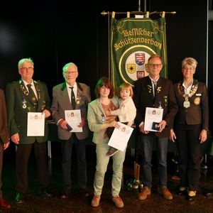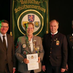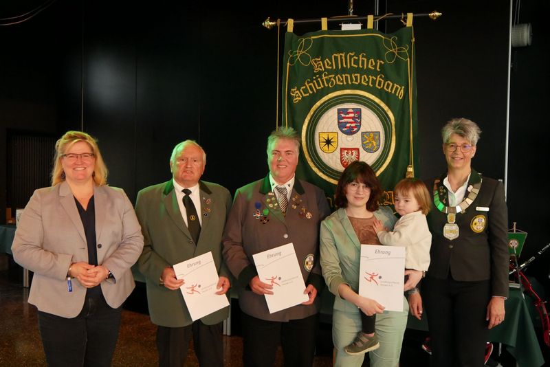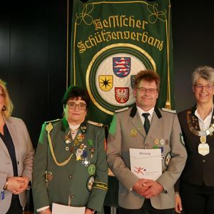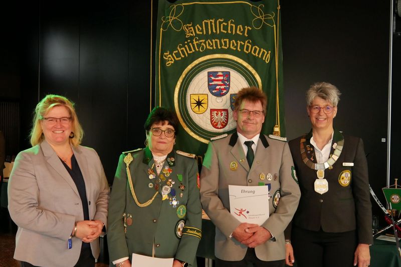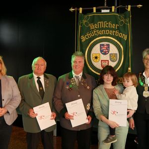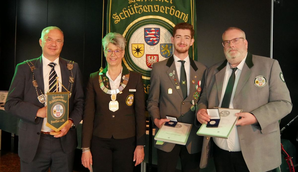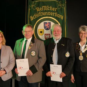 Der festliche Rahmen der Delegiertenversammlung bildete im weiteren Verlauf die Bühne für insgesamt rund 70 Ehrungen verdienter Persönlichkeiten des Schützenwesens. Den Auftakt machten Tanja Frank und die Präsidentin des Landessportbundes Hessen (LSBH), Juliane Kuhlmann, mit den Auszeichnungen des Dachverbandes. Als höchste Würdigung des LSBH wurde die Ehrennadel in Bronze an Hartmut Guckes und Norbert Baumann verliehen. Weiterhin erhielten Monika Vöhl, Michael Kratz und Marina May die Verdienstnadel des Landessportbundes, während Birgit Alberding und Michael Prokisch mit der Ehrenurkunde gewürdigt wurden.