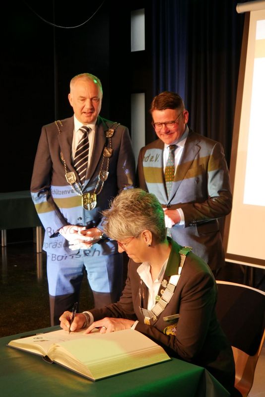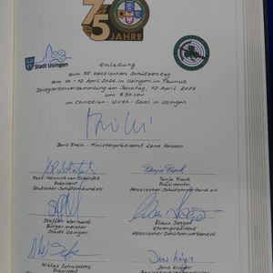 Zum Abschluss seines Besuchs folgte ein zeremonieller Akt von bleibendem Wert für die Stadt Usingen. Ministerpräsident Boris Rhein trug sich gemeinsam mit DSB-Präsident Hans-Heinrich von Schönfels, HSV-Präsidentin Tanja Frank und dem Usinger Bürgermeister Steffen Wernard in das Goldene Buch der Stadt ein. Auch HSV-Ehrenpräsident Klaus Seeger, der Vorsitzende des SV Usingen Niklas Schnieders und Bezirksschützenmeister Jens Krüger verewigten sich in dem Dokument, was den historischen Charakter dieses 75. Hessischen Schützentages in der Buchfinkenstadt unterstrich.
