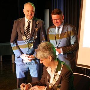 Nach dieser Ehrung der lokalen Organisatoren folgte ein symbolträchtiger Moment, der den Blick bereits auf die Zukunft richtete. Der Usinger Bürgermeister Steffen Wernard übergab offiziell eine Fahne des Hessischen Schützenverbandes an seinen Amtskollegen Boris Wenz aus Bürstadt. Damit wurde die Gastgeberschaft für das kommende Jahr förmlich besiegelt. Boris Wenz nutzte die Gelegenheit, um im Namen der südhessischen Stadt Bürstadt eine herzliche Einladung zum 76. Hessischen Schützentag 2027 auszusprechen, der im Hessischen Ried stattfinden wird. Er sprach dem Präsidium des Verbandes seinen Dank für das entgegengebrachte Vertrauen aus und hob zudem die Bedeutung des Pfeil- und Bogenclubs Bürstadt hervor, der maßgeblich an der Ausrichtung beteiligt sein wird. Mit den Worten: „Kommen Sie nach Bürstadt, erleben Sie unsere herzliche Gastfreundschaft. Wir freuen uns auf Sie!“, unterstrich er die Vorfreude seiner Heimatstadt auf das kommende Großereignis.