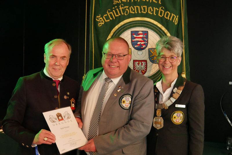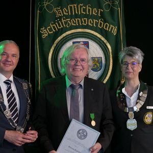 Ein ganz besonderer Moment der Anerkennung, markierte die Ernennung eines neuen Ehrenmitglieds. Nachdem er kurz zuvor bereits mit der Goldenen Medaille am grünen Band des Deutschen Schützenbundes ausgezeichnet worden war, rechnete der langjährige Pressereferent des Hessischen Schützenverbandes, Werner Wabnitz, offensichtlich nicht mit einer weiteren Steigerung der Ehrungen. Als Präsidentin Tanja Frank ihn zum Abschluss des Ehrungsblocks erneut auf die Bühne bat, dauerte es sichtlich einige Sekunden, bis Wabnitz realisierte, dass ihm eine der höchsten Auszeichnungen des Verbandes zuteilwerden sollte. Die Überraschung war dem Mann, der sonst meist hinter der Kamera oder am Notizblock steht, deutlich anzumerken.