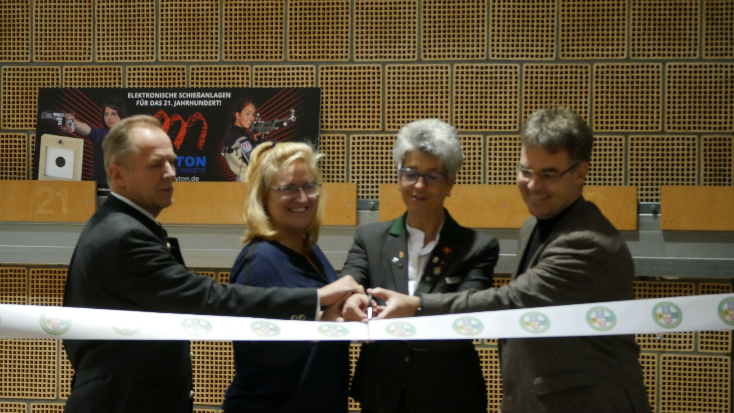 Nach den Grußworten wurde die modernisierte Schießhalle offiziell ihrer Bestimmung übergeben. HSV-Präsidentin Tanja Frank zerschnitt zusammen mit Hans-Heinrich von Schönfels, Juliane Kuhlmann und Georg Kemper ein Band, das zwischen zwei elektronischen Messrahmen gespannt war.