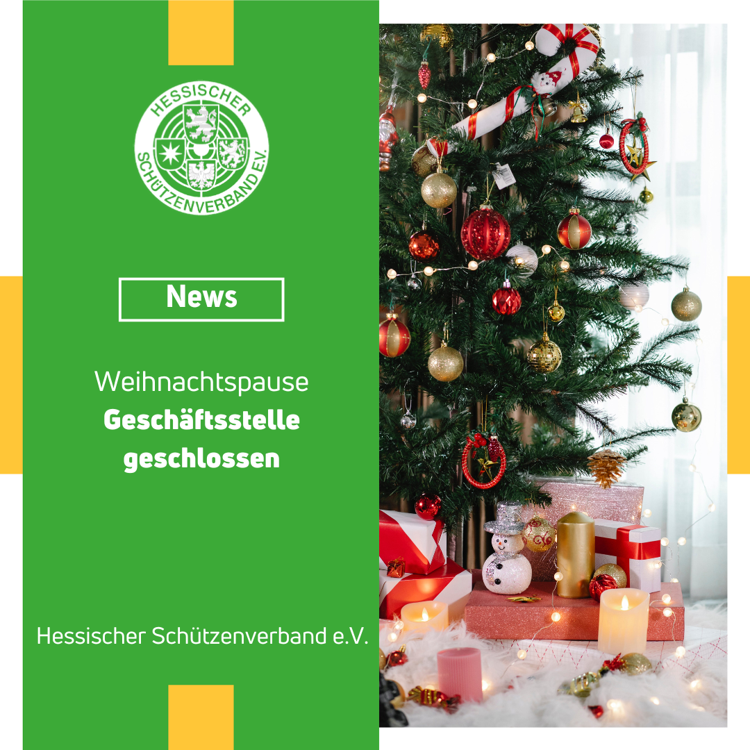 Das gesamte Team der Geschäftsstelle des Hessischen Schützenverbandes wünscht euch besinnliche Weihnachtstage, einen entspannten Jahreswechsel und für das Jahr 2024 "Gut Schuss" und "Alle ins Gold"!