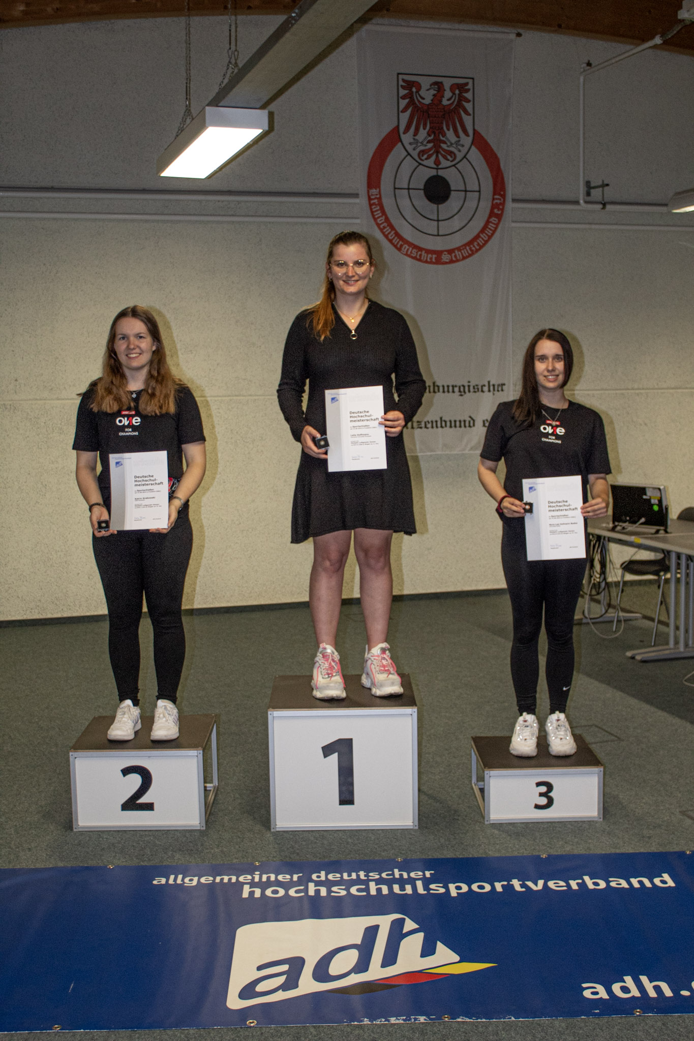 Im Finale bestätigte Leila Hoffmann ihre starke Form. Sie kam auf 248,3 Ringe und übertraf ihr Finalergebnis von den Hessischen Meisterschaften um 0,8 Ringe. Nur 0,4 Ringe dahinter gewann Katrin Grabowski mit 247,9 Zählern die Silbermedaille. Lenja Charlene Möller fiel im Finale leider zurück , musste zwei weitere hessische Schützinnen vorbeiziehen lassen und kam am Ende auf den fünften Rang. Bronze ging an Nora-Lee Hofmann Badea (Universität Gießen, Büdinger SG) und den vierten Platz sicherte sich Katharina Mentzel (Hessische Hochschule für öffentliches Management und Sicherheit Wiesbaden, Wiesbadener SG). Hofmann Badea hatte in der Qualifikation mit 621,6 Ringen Platz vier erreicht, Mentzel war mit 618,3 Zählern als fünfte in das Final eingezogen.