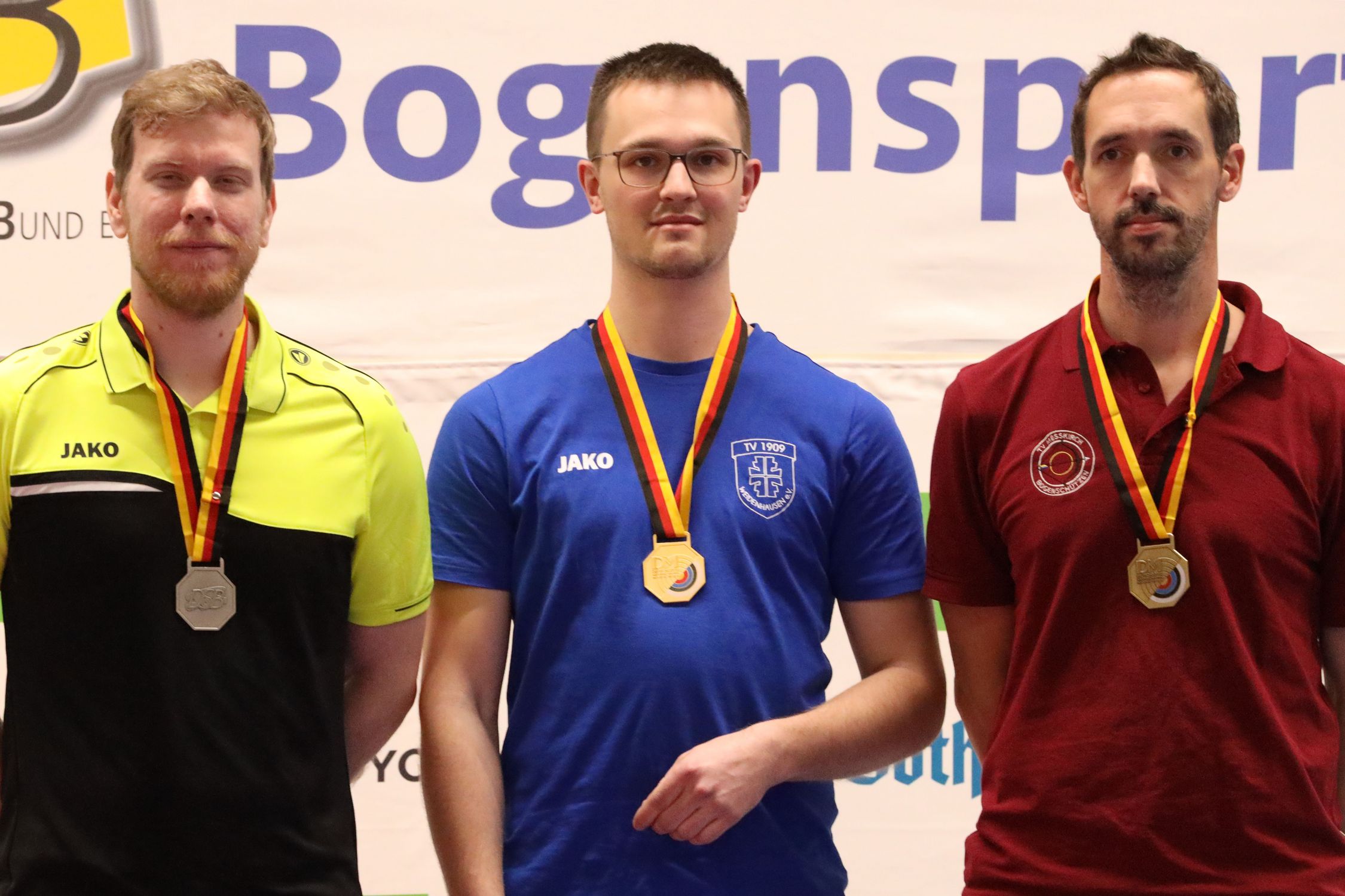 Dass Jeremy Achenbach den Deutschen Meistertitel gewinnen wird, zeichnete sich im 60 Pfeile Vorkampf auf 18 Meter Entfernung noch nicht ab. Mit 288 Ringen nach den ersten 30 Pfeilen lag er nur auf dem 20. Platz und drohte erst gar nicht das Finale der besten 16 zu erreichen. In der zweiten Runde steigerte er sich auf 294 Ringe und schaffte damit den Sprung auf den elften Platz. Zum Auftakt der Finalrunde bekam er mit dem neunfachen Deutschen Meister und Titelverteidiger Henning Lüpkemann vom TV Meßkirch eine kaum lösbare Aufgabe, aber der junge Hesse ließ sich nicht beeindrucken. Erste Schwächen seines Gegners nach neun Pfeilen im 15-Pfeile-Finale nutzte er und warf den hohen Favoriten mit eindrucksvollen 148:144 Ringen aus dem Rennen.