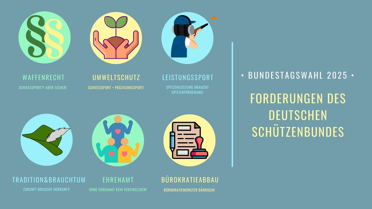 Die Punkte Waffenrecht, Umweltschutz, Leistungssport, Tradition & Brauchtum, Ehrenamt sowie Bürokratieabbau werden aufgegriffen und mit zentralen Forderungen des DSB versehen, „um sicherzustellen, dass auch zukünftig der Schieß- und Bogensport in Deutschland durch unsere Mitglieder in der gewohnten Form ausgeübt werden kann und ihr erbrachtes ehrenamtliches Engagement für die Gesellschaft gebührend wahrgenommen und gewürdigt wird.“, heißt es in der Einführung.