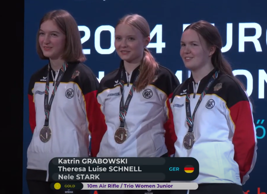 In der Einzelwertung lief es für die deutschen Luftgewehr-Juniorinnen nicht ganz optimal. Katrin Grabowski erreichte als beste deutsche Teilnehmerin mit 625,2 Ringen Platz 12. In der Mannschaftswertung kam sie zusammen mit Nele Stark (624,5 – Platz 17) und Theresa Luise Schnell (623,8 – Platz 23) auf den Bronzerang.