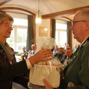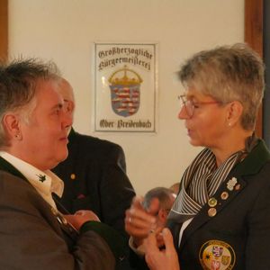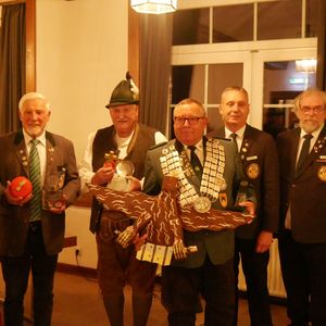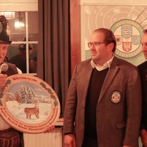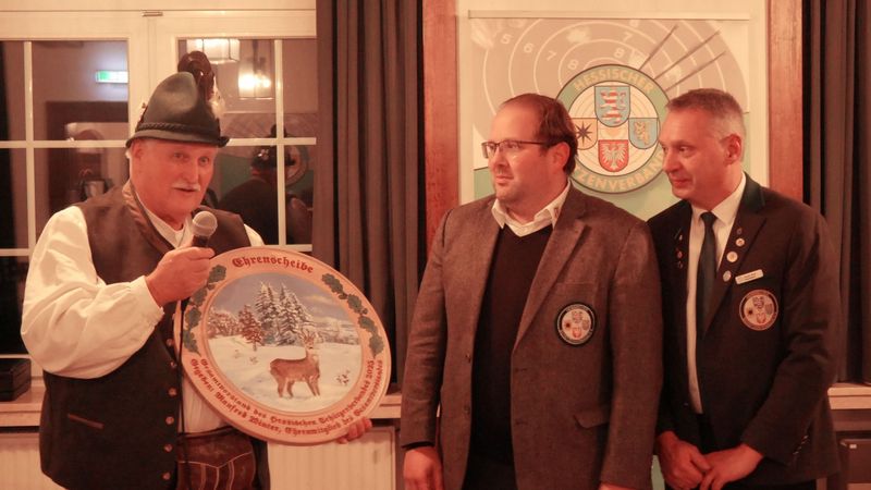 Im Verlauf des Abends wurden nicht nur das neue Königshaus des Gesamtvorstandes proklamiert, sondern auch der Gewinner der Ehrenscheibe bekannt gegeben. Beim Ehrenscheibenschießen gibt jedes Mitglied des Gesamtvorstandes einen Schuss auf eine Scheibe in 50 Metern Entfernung ab – der beste Treffer entscheidet. Ehrenmitglied Manfred Winter, Sieger des Vorjahres, überreichte die kunstvoll gestaltete Ehrenscheibe an den neuen Gewinner: Florian Keil, Bezirksschützenmeister des Bezirks 38 Starkenburg, nahm die Scheibe, die eine Gams in einer verschneiten Hügellandschaft zeigt, erfreut entgegen.