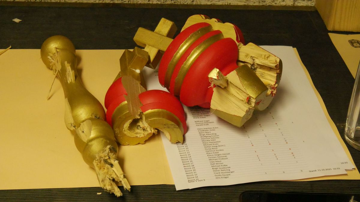 Am längsten dauerte wie gewohnt der Kampf um den Rumpf – und damit um den Königstitel. Nach 1 Stunde und 24 Minuten und insgesamt 103 Schuss fiel schließlich der Adler. Klaus-Jürgen Hensel, Bezirksschützenmeister des Schützenbezirks 24 Marburg, schoss den Vogel ab und wurde damit neuer Schützenkönig des Gesamtvorstandes 2025.