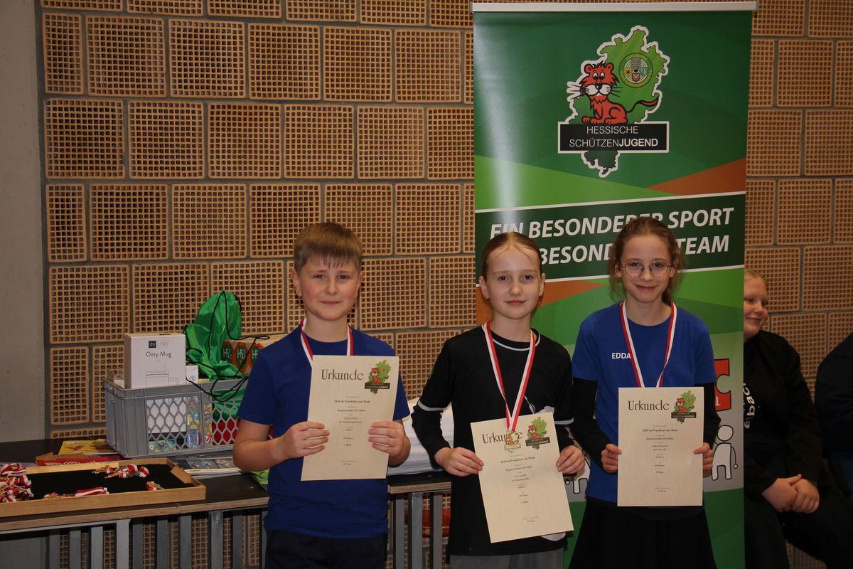 Bei den Schützen der Jahrgänge 2012 und 2013 (die auf die kleineren 60er-Scheiben schießen) kam Juli Huber (Jahrgang 2013) vom SV Eberstadt als beste Teilnehmerin auf 518 Ringe. Das zweitbeste Ergebnis in dieser Altersgruppe erreichte Kseniia Kolpakchiieva (Jahrgang 2013) vom BSC Rüsselsheim mit 505 Ringen. Bei den Schützinnen und Schützen des Jahrgangs 2012 konnte sich Ronja Kuhlmey vom SV Böddiger mit 502 Ringen durchsetzen.